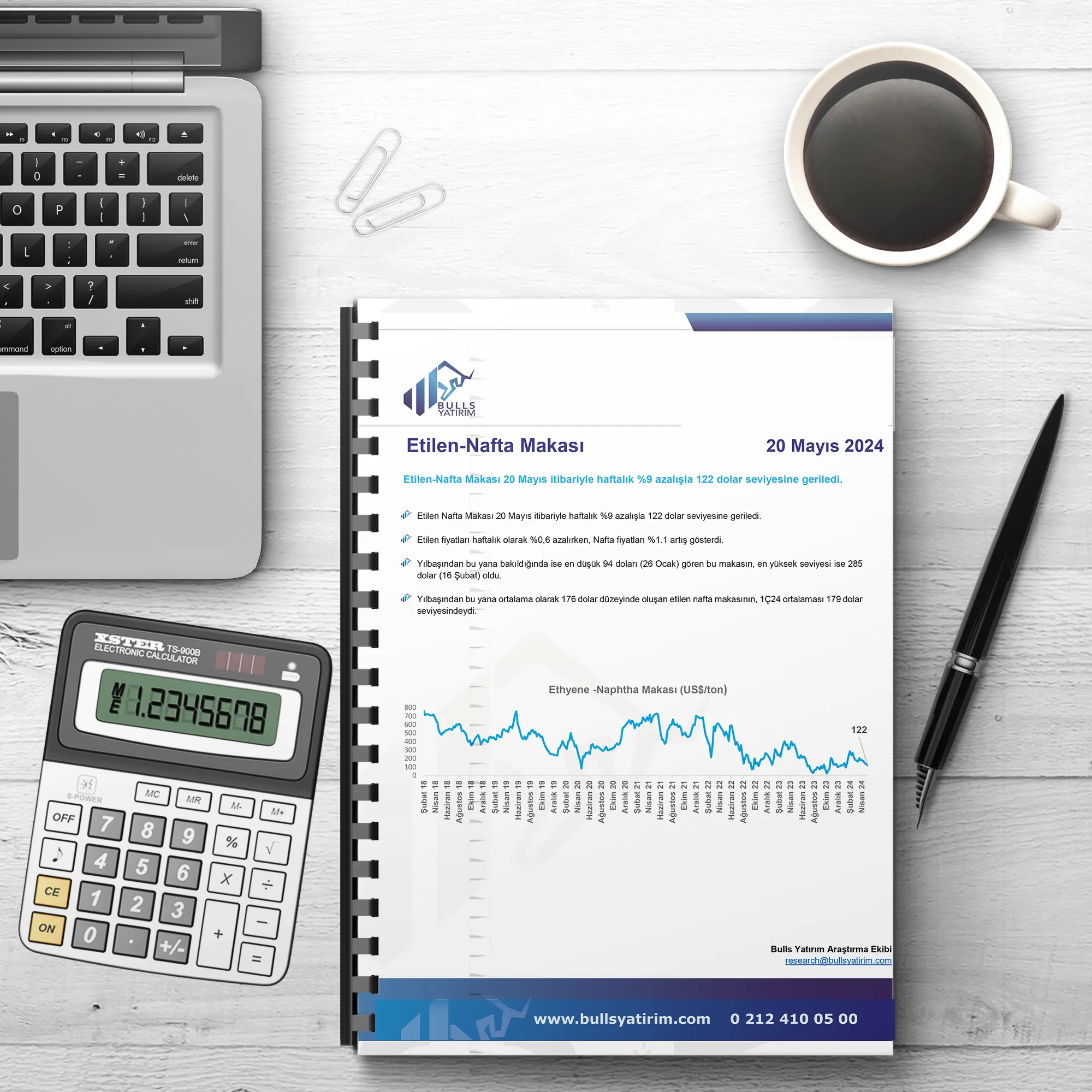 20.05.2025 Etilen Nafta Makası 20 Mayıs itibariyle haftalık %9 azalışla 122 dolar seviyesine geriledi. Etilen fiyatları haftalık olarak %0,6 azalırken, Nafta fiyatları %1.1 artış gösterdi....